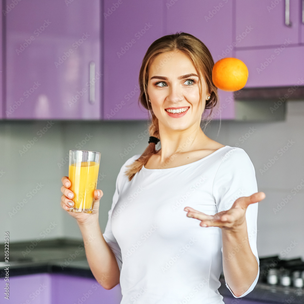 Beautiful young woman with orange juice and orange. Square. The concept