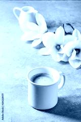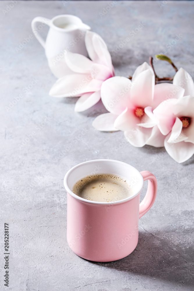 Pink mug of black espresso coffee with spring flowers magnolia branches over grey texture background. Top view, space.