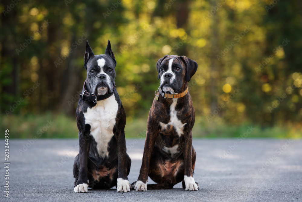 two german boxer dogs sitting together outdoors in summer