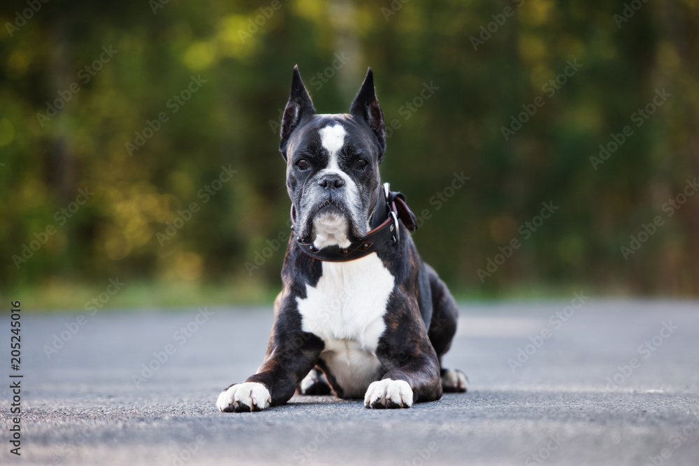 german boxer dog lying down outdoors in summer