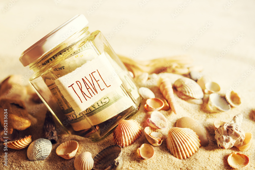 Bank for money with the inscription TRAVEL and seashells on sand. Piggy bank for travel, vacation plans, savings.