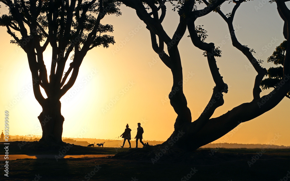 Dog walkers and coral trees at sunset in a harborside San Diego park.