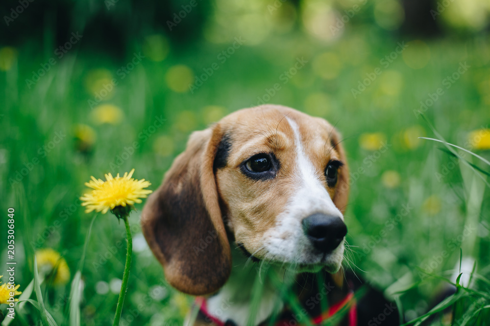Close up portrait of beagle puppy sitting on a green meadow with yellow flowers