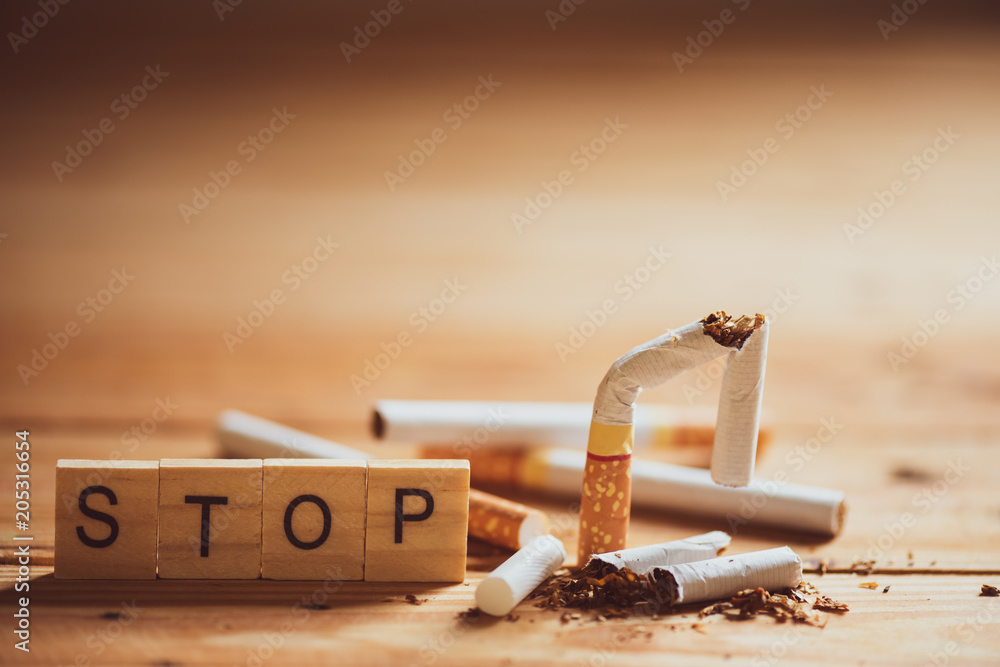 World No Tobacco Day, May 31. Close up Broken cigarette with STOP text on Wooden Block on wooden table background.