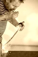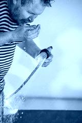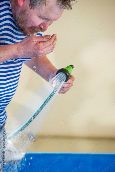 man drinks water from a hose on a hot day.