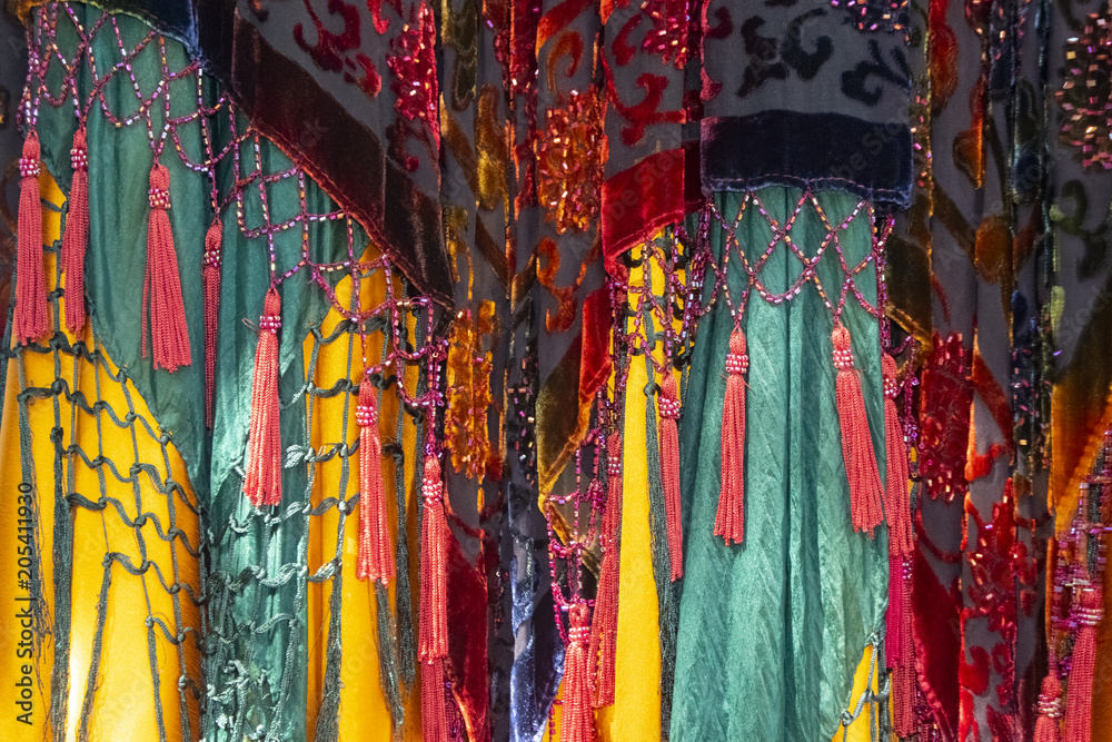 Brightly colored and saturated boho background with layers of fabrics and tassels and net