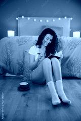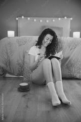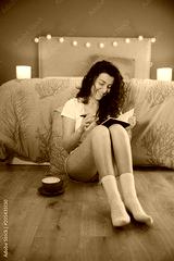 young woman sitting on the floor next to the bed reading and writing her diary and taking coffee in the bedroom