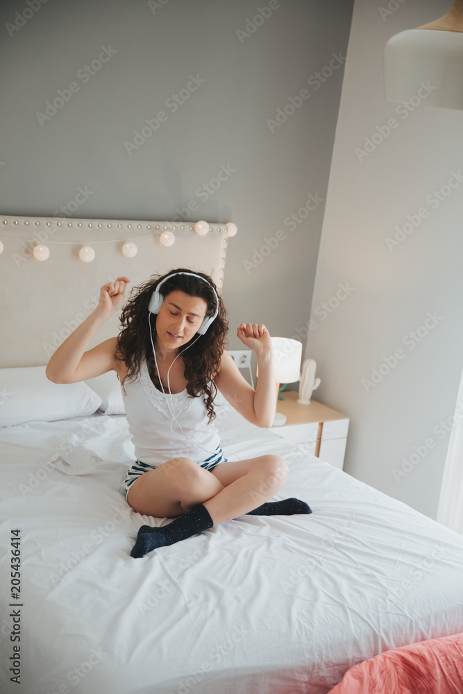 beautiful young woman listening music in headphones and dancing in her bedroom, happy time song and good morning concept