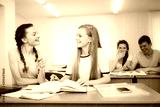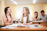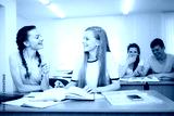 Two happy students learning on line together with a computer in a classroom with other classmate in the background