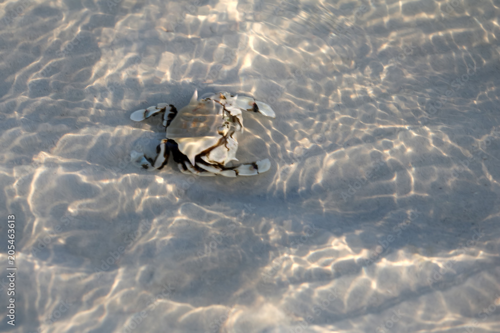 Hermit crab on sand under a shallow sea water with sunlight reflections