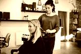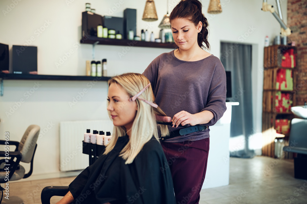 Hairdresser straightening a client's long blonde hair in her sal