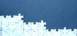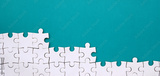 Fragment of a folded white jigsaw puzzle on the background of a blue plastic surface. Texture photo with copy space for text