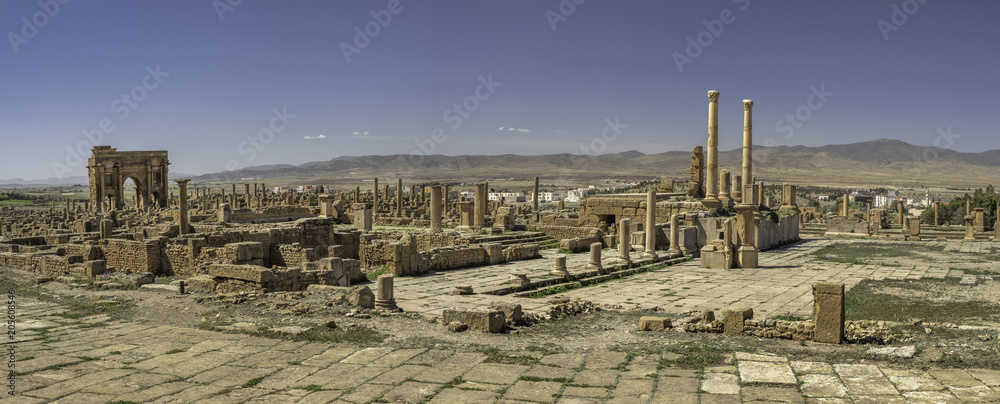 Ruins of Timgad, a Roman-Berber city in the Aures Mountains (Colonia Marciana Ulpia Traiana Thamugadi) with Trajans' arch and Capitol, Algeria
