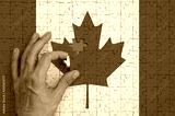 Canada flag is depicted on a puzzle, which the man's hand completes to fold
