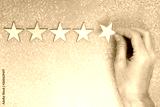 five wooden stars and hand putting the last one to increase rating on a silver background, top view with copy space