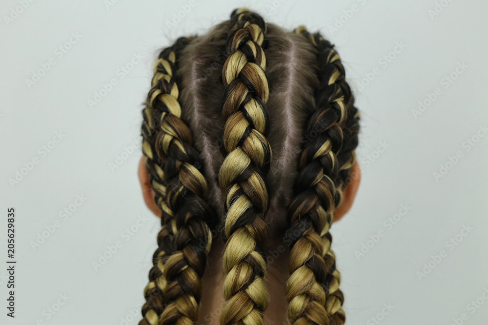 five thick braids on the head of a girl standing with her back on a white background close-up