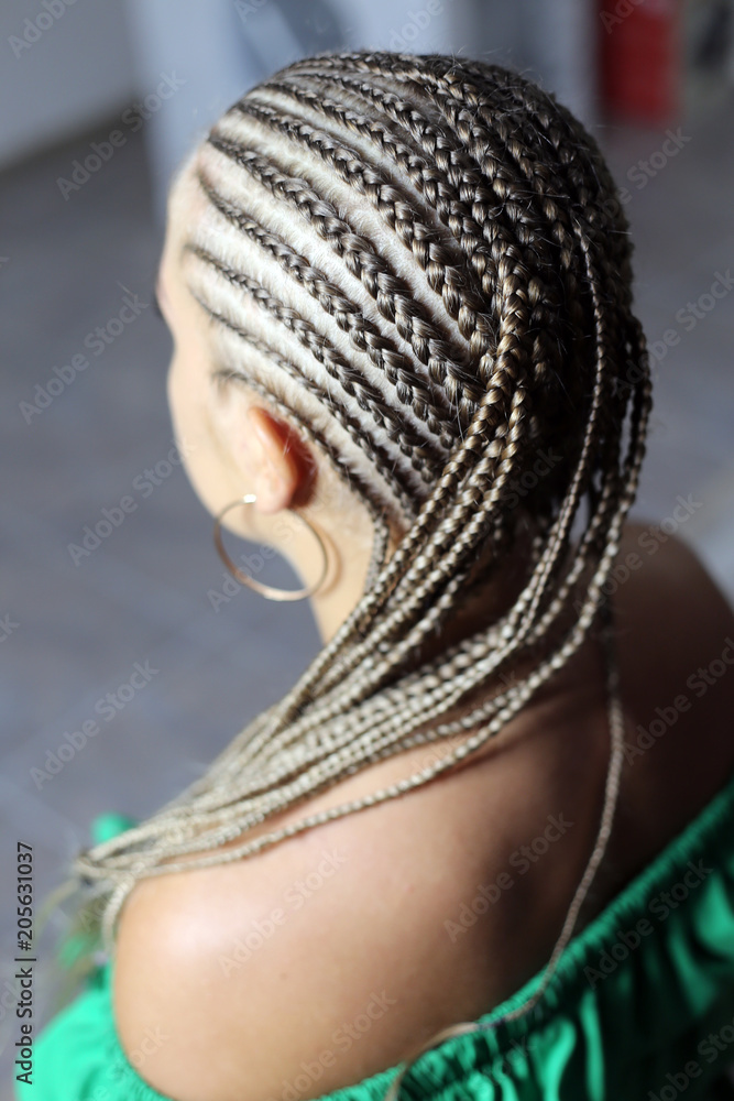 The process of creating an African hairstyle super curls, Senegal pigtails, boxing braids, the material is attached to a thin pigtail, ready hairstyle
