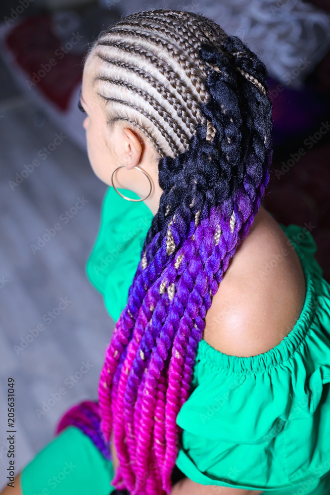 the process of interlacing the mambotwists, the girl is braided over the head with the cornrow and an artificial material of violet and black tie is attached to them