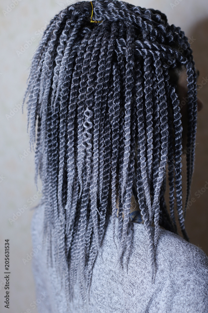thin braids in an African style for a girl, hairstyle close-up on a white background, spirals, aurican youth style braids, beauty salons
