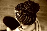 African braids are gathered in the tail with a pattern from the cornrow on the temple, an original youth hairstyle