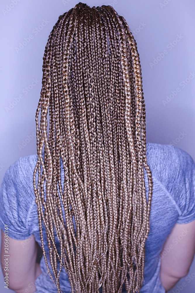 braiding of braid on the beach, beauty salons, corn rows on the head of a girl, many thin braids in an African style, a woman, a kanekalon