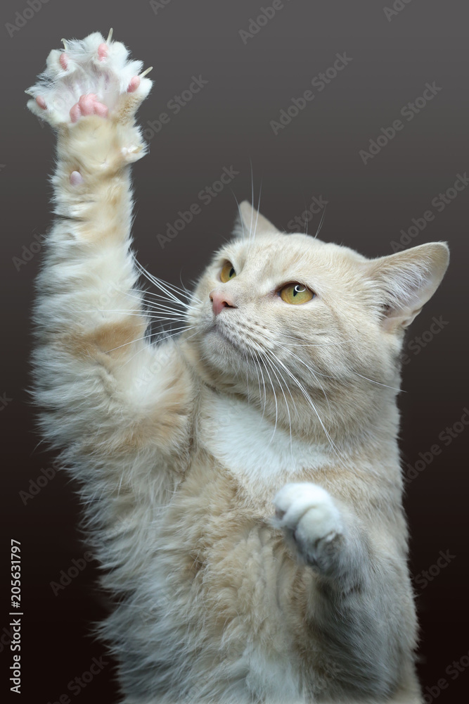 a red cat of sand color on a neutral background plays, an evil look, yellow eyes, claws on the paw, raised a paw up