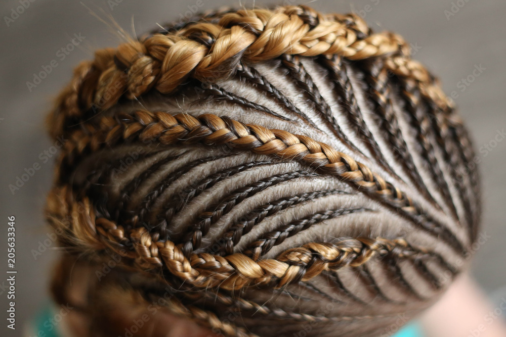 hairstyles from thin plaits on the head of a girl, a master, a beauty salon, a beauty trail