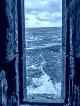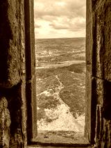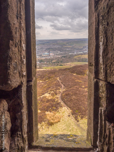 View across the Darwen moors through one on the windows of Darwen tower, Lancashire, UK