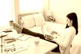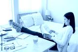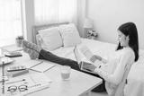 Asian female freelancer reading report paper and working with laptop lay on knee with rest leg on table in bedroom at home.Work at home concept.work from home.relax lifestyle.