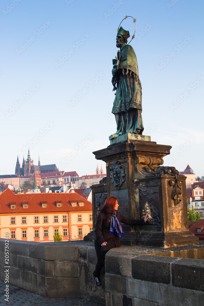 Beautiful young woman is touching the bronze plaque on Charles bridge for good luck. View at distance of St. Vitus Cathedral and historical center of Prague Castle. Czech Republic.