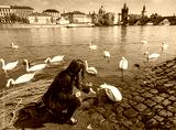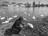 Beautiful young woman with long hair is feeding swans on Vltava river. View of Charles bridge and historical center of Prague,buildings and landmarks of old town. Czech Republic.