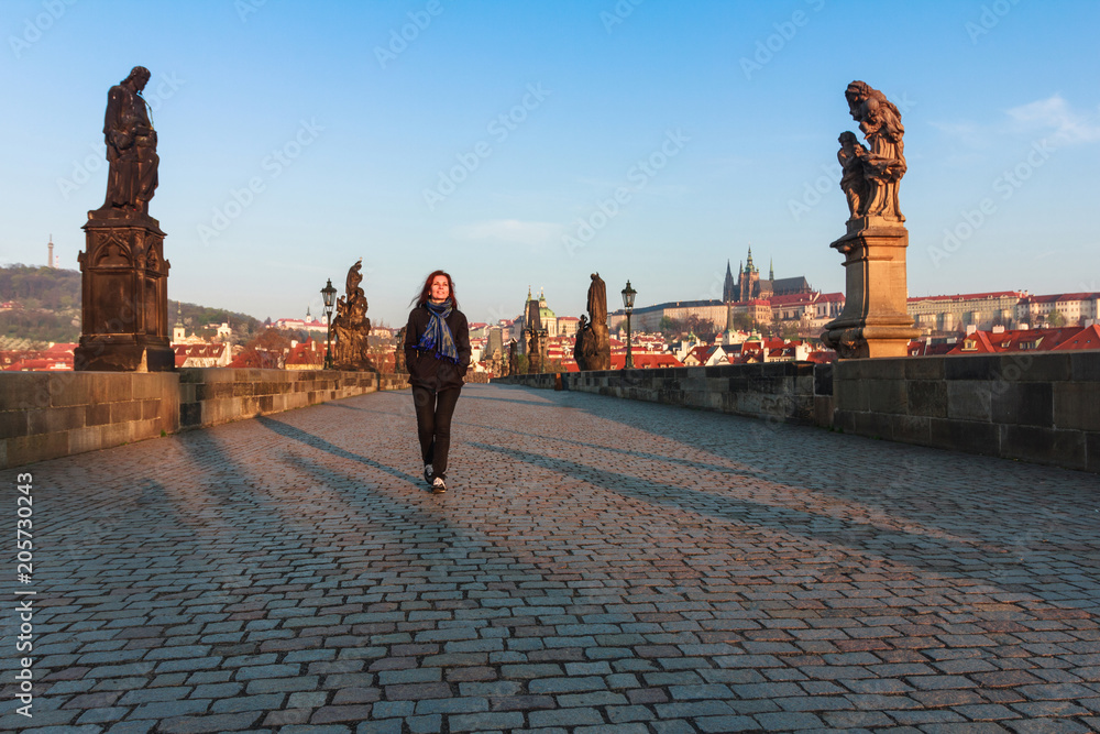 Happy young womanis walking through the Charles bridge. View at distance of St. Vitus Cathedral and historical center of Prague Castle, buildings and landmarks of old town. Czech Republic.