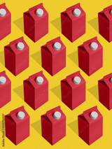 Milk package Pop art Pattern with pink cartons of milk in isometric perspective on a yellow background