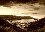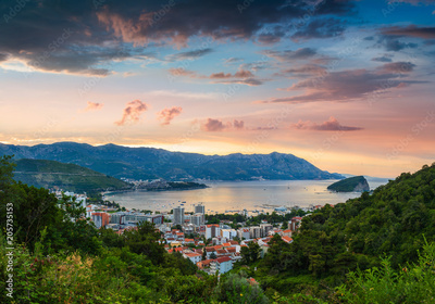 Panoramic landscape of Budva riviera in Montenegro at sunrise. Dramatic morning light. Balkans, Adriatic sea, Europe. View from the top of the mountain.