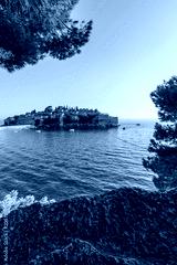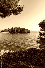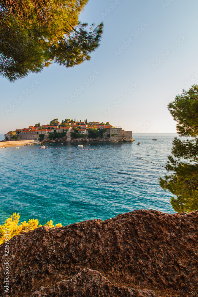 View in the Adriatic sea and Sveti Stefan at sunset. Milocer Park. Coast Budva Riviera. Montenegro.
