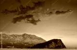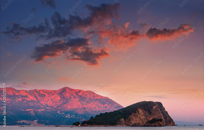 View of Sveti Nikola island and budva riviera at sunset. Dramatic evening sky. Montenegro, Adriatic sea, Europe.