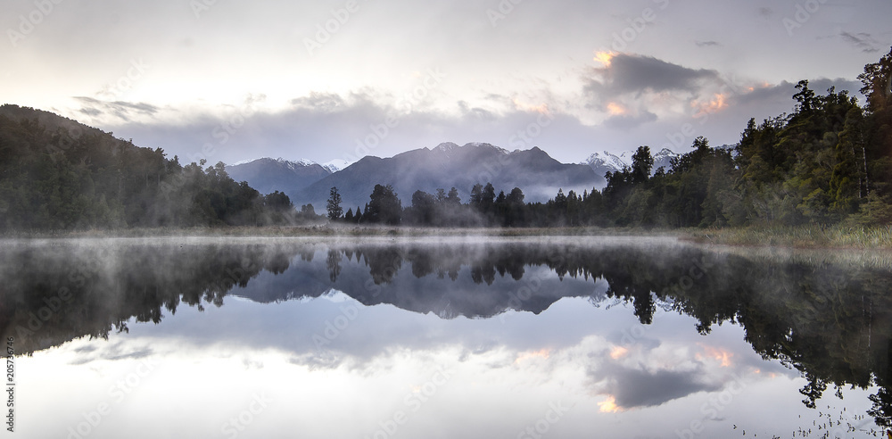 New Zealand lake view refection with morning sunrise sky