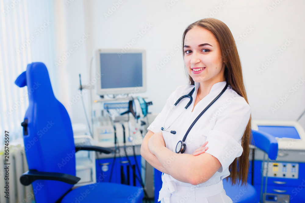 healthcare and health. ENT. young doctor is an otolaryngologist with arms crossed in a modern office. The pediatrician invites to the examination
