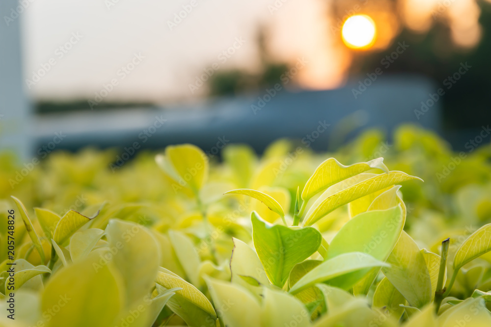 Summer Nature concept. Green leaf in garden under sunset. Natural green plants.