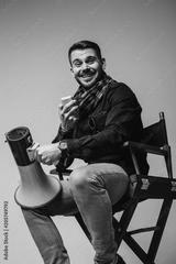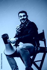 Portrait shot of handsomeyoung film director in stylish clothes holding megaphone an smiling while sitting on the chair. Isolated on grey background in the studio