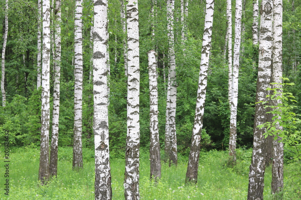 Beautiful birch trees with white birch bark in birch grove with green birch leaves in early summer