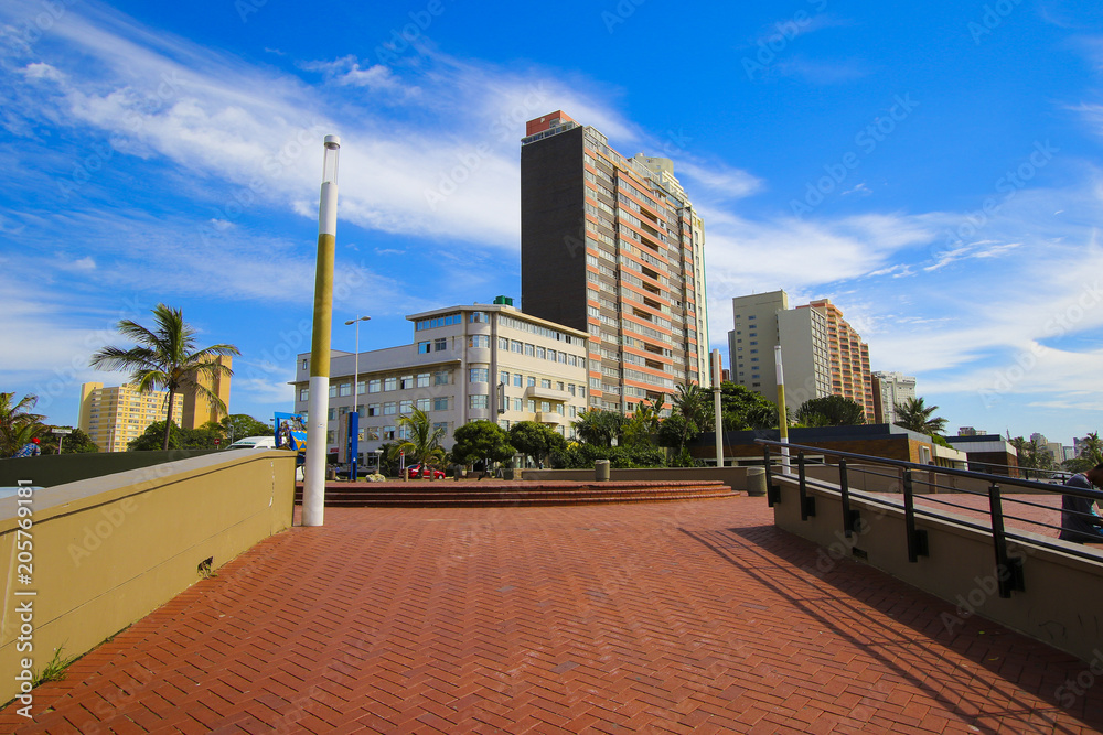 Residential building behind the paved promenade of Durban's "Golden Mile" beachfront, KwaZulu-Natal province of South Africa