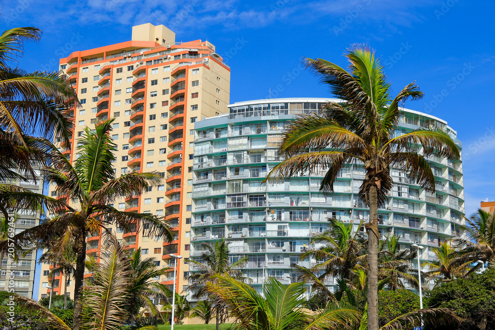 Residential buildings with palm trees on Durban's "Golden Mile" beachfront, KwaZulu-Natal province of South Africa