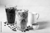 Ice coffee in a tall glass with cream poured over and coffee beans. Cold summer drink on a light blue background