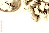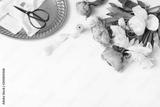 Styled stock photo. Feminine wedding or birthday table composition with floral bouquet. White and pink peonies flowers, old vintage scissors, silver tray and silk ribbons. White background.