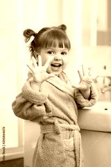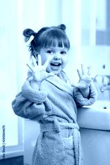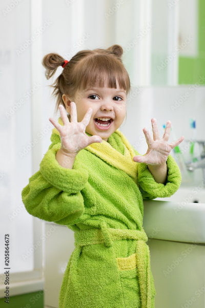 child in bathrobe washing hands in bathroom and showing soapy palms