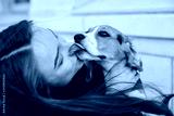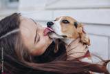 Close up cute little beagle dog kissing beautiful young woman. Beagle puppy licking with tongue young brunette girl. Outdoors. Hair in the wind