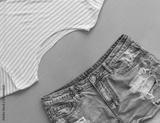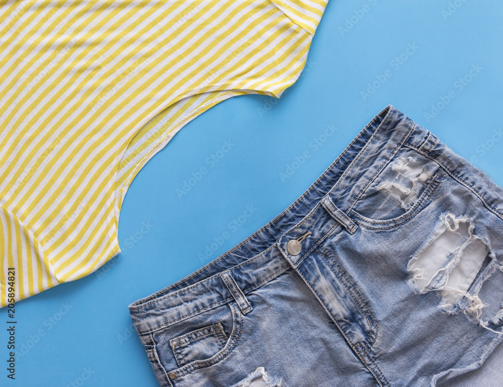 denim shorts and striped yellow t-shirt on blue background, summer clothes, top view