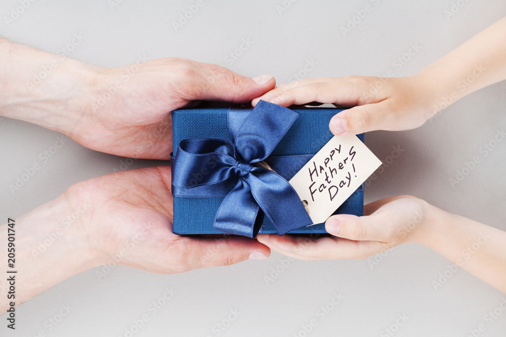 Son gives daddy present or gift box with tag on Happy fathers day. Holiday concept top view.