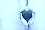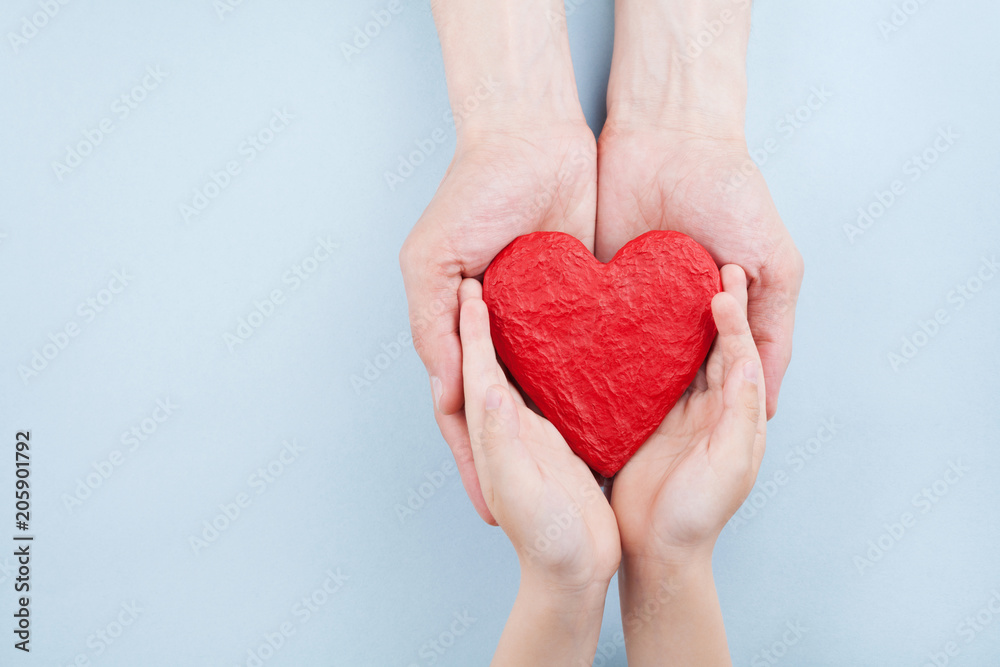 Doctor and kid holding red heart in hands top view. Family relationships, health care, pediatric cardiology concept.